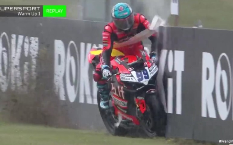 Septiembre de 2024. En una de las imágenes más impresionantes del motociclismo reciente, Adrián Huertas protagonizó una “salvada del año” durante la sesión de calentamiento del World Supersport en Magny-Cours, bajo condiciones de pista resbaladiza por la lluvia.