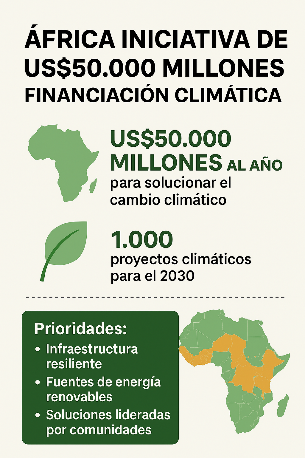 En la Cumbre Africana del Clima en Addis Abeba, los mandatarios africanos propusieron movilizar US$50.000 millones anuales para financiar innovación climática, infraestructura resiliente y soluciones verdes lideradas por el continente, en respuesta al déficit de financiación frente al cambio climático.