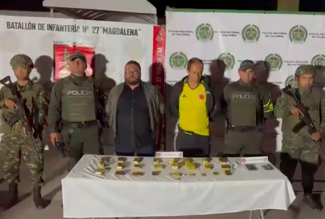 Las autoridades informaron la captura de dos hombres que transportaban 28 lingotes de oro escondidos dentro del tanque de gasolina de un vehículo en una carretera del sur del país. El hallazgo se produjo durante un operativo de control realizado por unidades de la Policía y el Ejército, que detectaron irregularidades en el automóvil tras una inspección rutinaria.