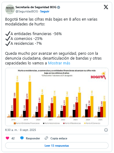 Bogotá celebra un avance significativo en materia de seguridad, ya que los datos recientes indican una importante disminución en los delitos de hurto. Durante los primeros ocho meses del año 2025, la capital ha registrado las cifras más bajas de robo a comercios, residencias y entidades financieras en los últimos ocho años. El hurto a comercios cayó un notable 25 %, mientras que el robo a residencias disminuyó en un 7 %. Estos resultados consolidan una tendencia a la baja que la administración distrital atribuye a una serie de estrategias de seguridad implementadas de manera conjunta.