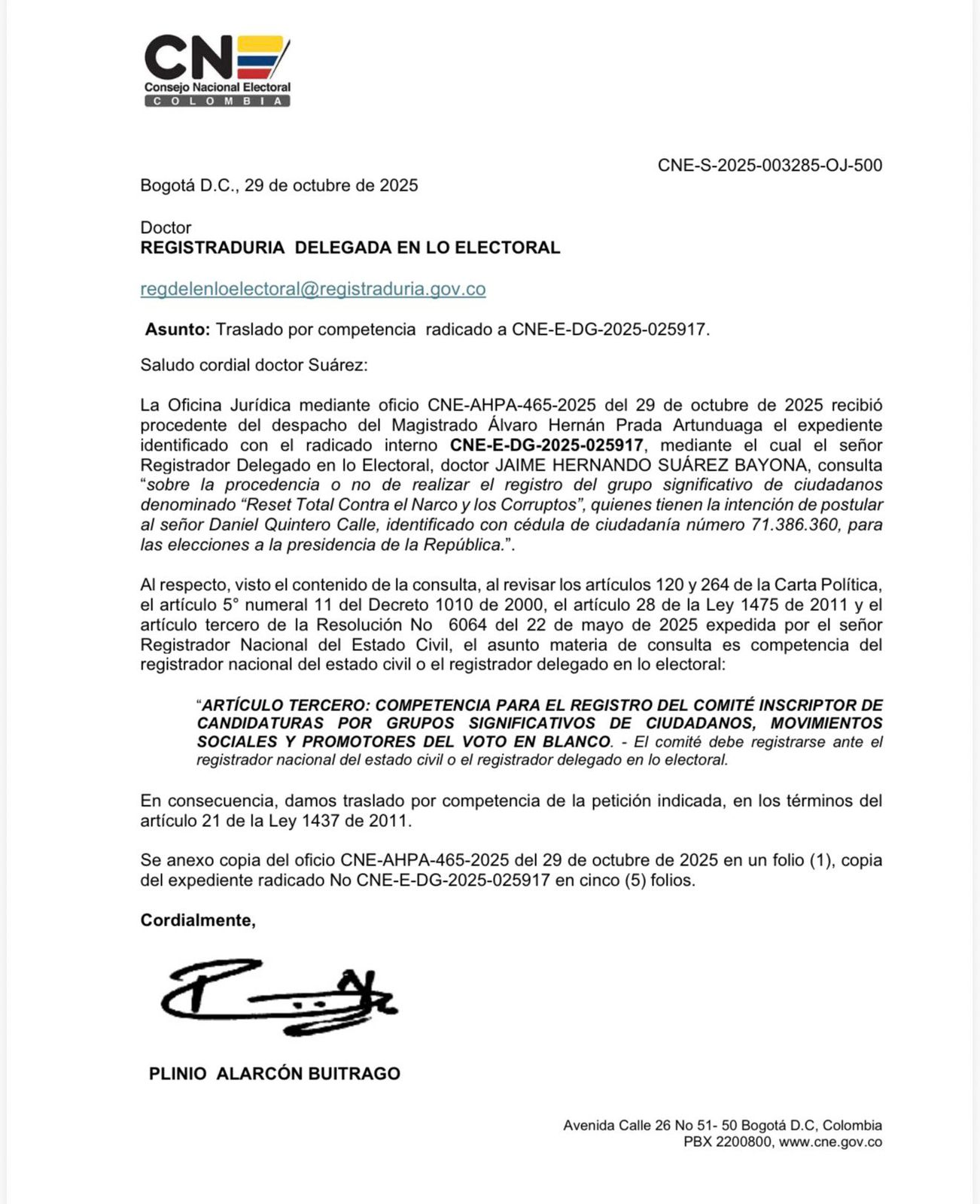 El Consejo Nacional Electoral (CNE) tomó la decisión de trasladar a la Registraduría Nacional del Estado Civil la inscripción del comité de recolección de firmas del precandidato Daniel Quintero . El CNE recordó que el asunto, en esta etapa inicial de inscripción del comité, no es de su competencia . Esta determinación simplifica el primer paso del proceso para el grupo promotor del precandidato.