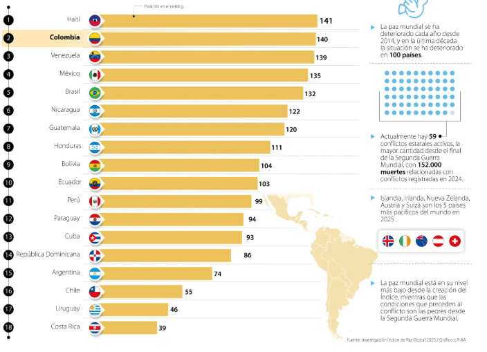 Según el Índice de Paz Global 2025 del Institute for Economics & Peace (IEP), Colombia ocupó el puesto 140 de 163 países, lo que lo sitúa como el segundo país menos pacífico de América Latina, solo por delante de Haití.