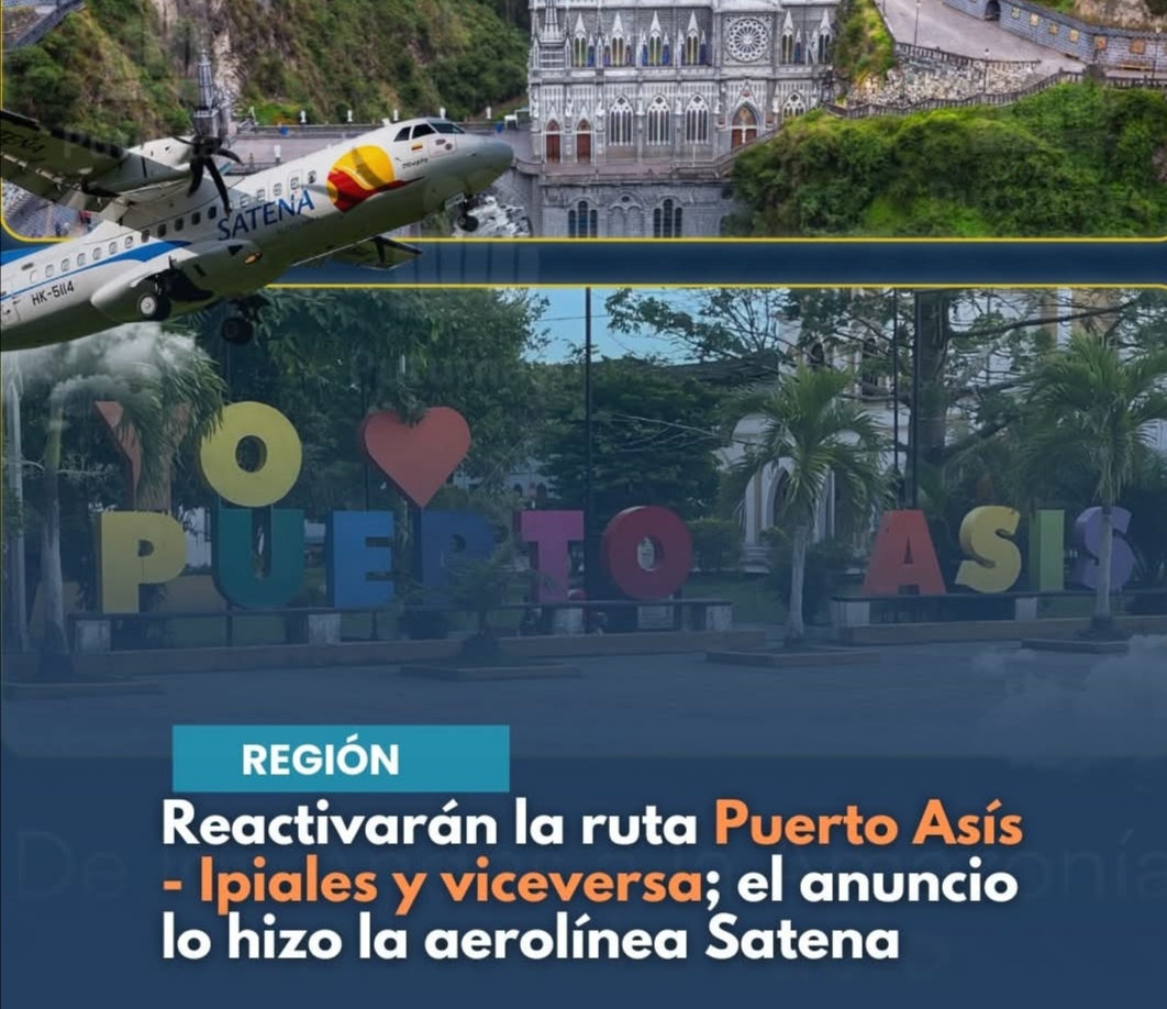 La aerolínea estatal Satena anunció la reactivación de la ruta directa entre Ipiales (Nariño) y Puerto Asís (Putumayo), uniendo estas dos regiones del sur del país. Esta iniciativa busca fortalecer la conectividad interna y acercar destinos remotos al corazón de Colombia.