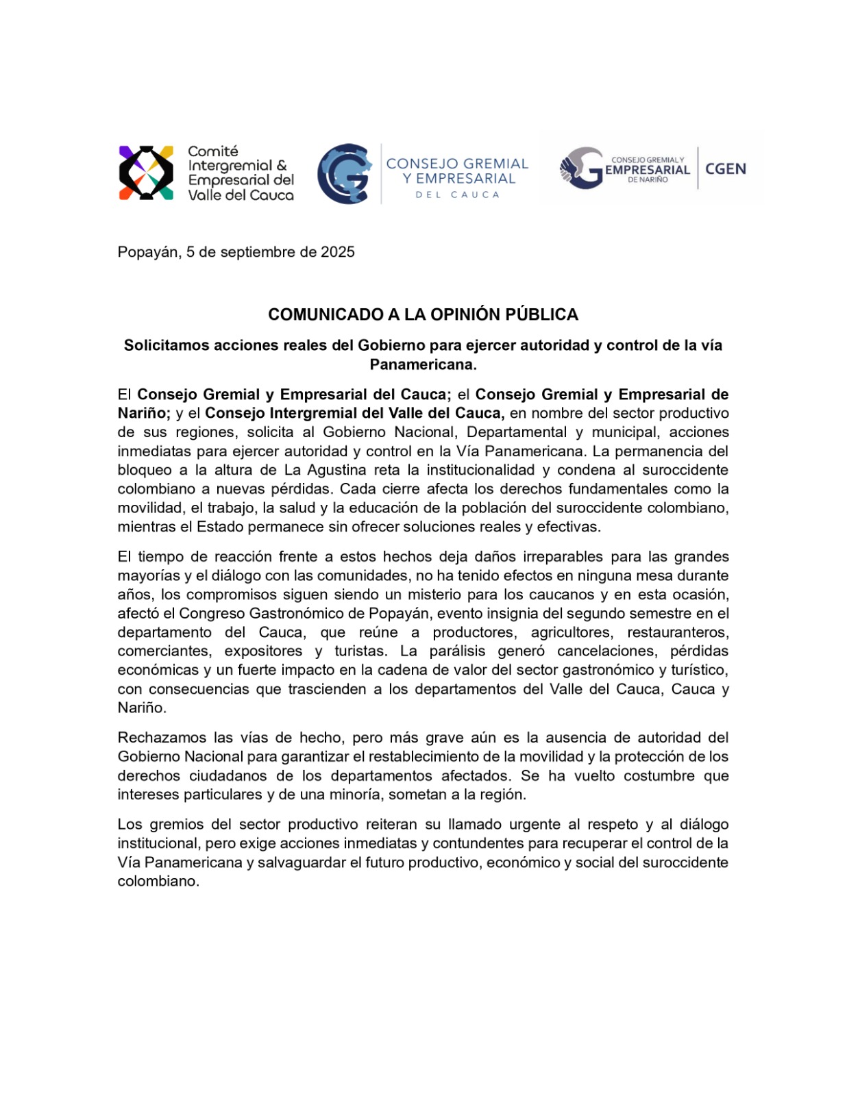 El Consejo Gremial y Empresarial de Nariño, junto al Consejo Gremial y Empresarial del Cauca y del Valle del Cauca, en nombre del sector productivo de sus regiones, solicitan al Gobierno Nacional, Departamental y municipal, acciones inmediatas para ejercer autoridades y control en la vía Panamericana.