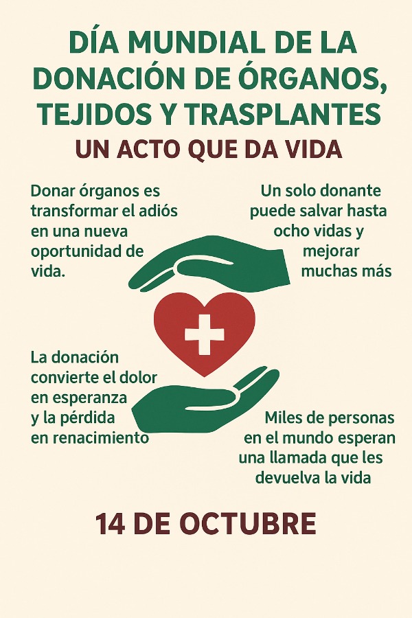 Cada 14 de octubre, el mundo se une para conmemorar el Día Mundial de la Donación de Órganos, Tejidos y Trasplantes, una fecha dedicada a promover la solidaridad, la empatía y la esperanza. Esta jornada busca crear conciencia sobre la importancia de donar órganos, tejidos y médula ósea, recordando que un solo donante puede salvar hasta ocho vidas y mejorar la calidad de muchas más.