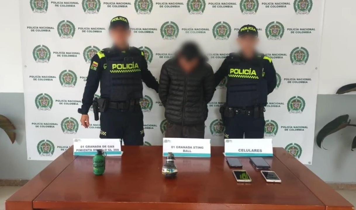 En las diligencias fueron incautados 4 teléfonos celulares, 1 granada aturdidora y de gas pimienta, 1 granada explosiva de perdigones con gas irritante, 1 chaleco tipo arnés y 200 gramos de marihuana.