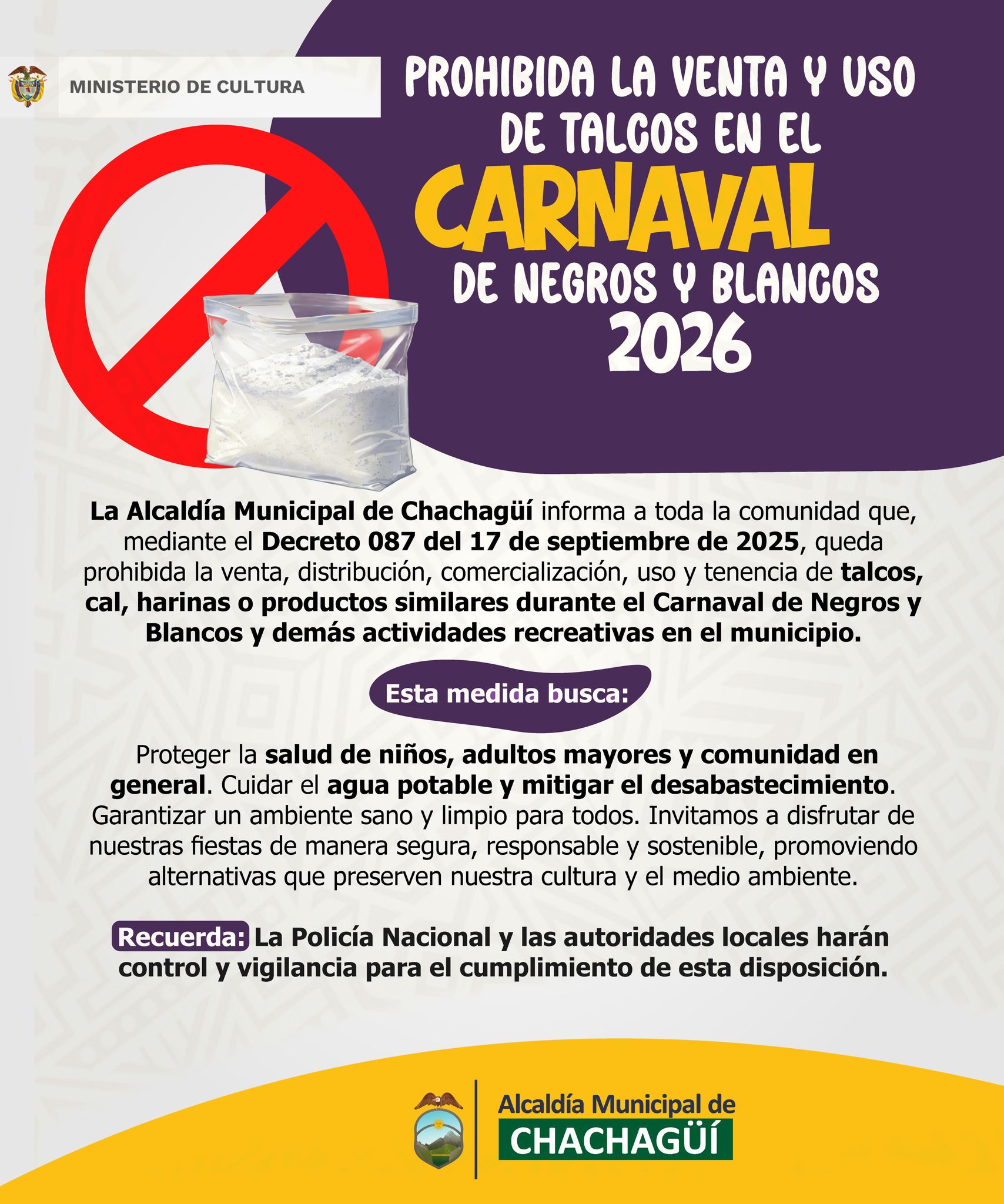 La Alcaldía Municipal de Chachagüí ha emitido el Decreto 087 del 17 de septiembre de 2025, que prohíbe la venta, distribución, comercialización, uso y tenencia de talcos, cal, harinas y productos similares durante el Carnaval de Negros y Blancos y otras actividades recreativas del municipio.