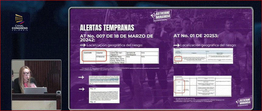 También su intervención habló de las muertes a integrantes de la fuerza pública, reclutamiento de menores y las alertas temprana emitidas por la Defensoria del Pueblo.