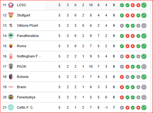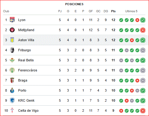 Europa League, no hay equipos con paso perfecto y hay tres equipos que comparten en liderato con 12 puntos: el Lyon, el Midtjylland y el Aston Villa de Dibu Martínez.