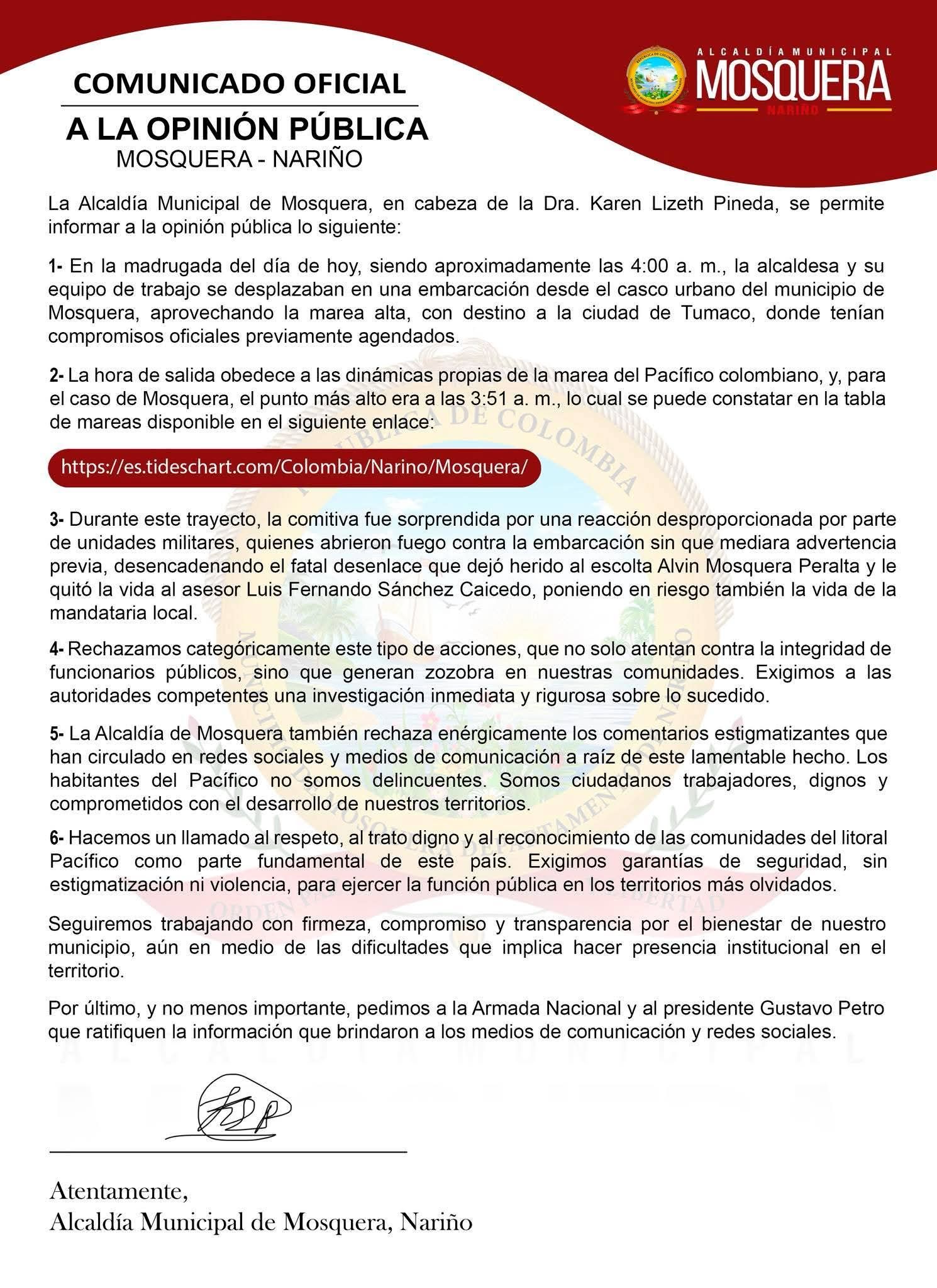 La Alcaldía de Mosquera condena de manera categórica el ataque armado perpetrado por unidades militares contra la embarcación oficial en la que se desplazaban la alcaldesa Karen Lizeth Pineda Pineda y su equipo de trabajo, en hechos ocurridos en el litoral pacífico nariñense.