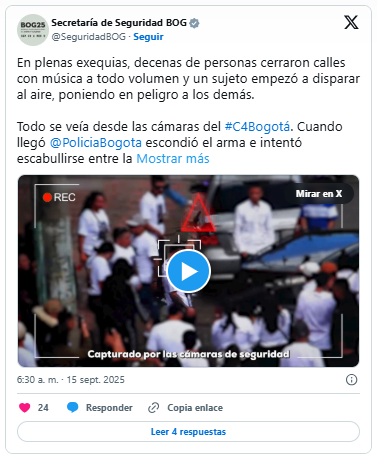 El incidente se produjo en medio de unas honras fúnebres, donde varios asistentes escuchaban música a alto volumen, consumían licor y bloqueaban una vía. En medio de esta situación, el hombre disparó su arma, lo que causó pánico entre los vecinos. Al ver la presencia de las autoridades, el hombre intentó escapar, pero las cámaras del C4 no le perdieron la pista.