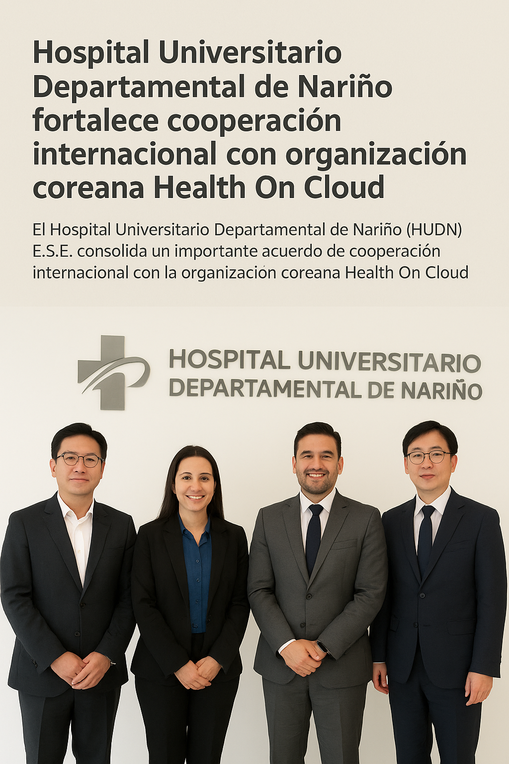 El Hospital Universitario Departamental de Nariño (HUDN) E.S.E., en articulación con el Instituto Departamental de Salud de Nariño (IDSN), consolida un importante acuerdo de cooperación internacional con la organización coreana Health On Cloud, orientado a fortalecer los procesos tecnológicos y de atención hospitalaria en la región.