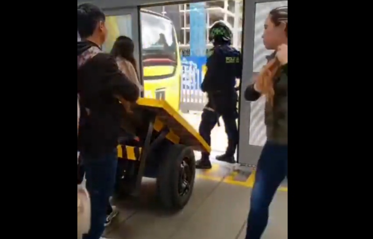 Un usuario ingresó recientemente con una carreta de gran tamaño a una estación de TransMilenio y pretendía subirla a uno de los buses articulados. Inmediatamente, la acción del ciudadano generó una situación anómala en el punto de abordaje. Un agente de la Policía que llegó al lugar no permitió al usuario continuar con el viaje. La intervención resultó necesaria para mantener el orden y garantizar la seguridad operacional, puesto que la carreta representaba un obstáculo significativo para el flujo de pasajeros y la circulación dentro del vehículo.