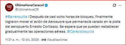 Por fallas en el tren de aterrizaje el avión de Aerosucre aterrizó en la pista del Aeropuerto Internacional Ernesto Cortissoz y se confirma que se iniciaron operaciones para mover la aeronave.