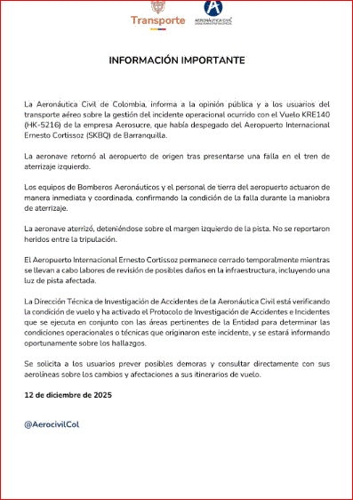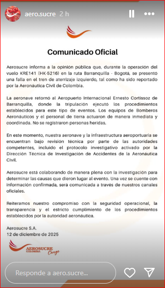 Aerosucre en un comunicado informó que durante la operación del vuelo KRE141 (HK-5216) en la ruta Barranquilla-Bogotá, se presentó una falla en el tren de aterrizaje izquierdo.