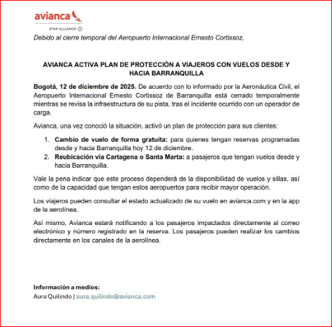 Avianca informó que habrá “cambio de vuelo de forma gratuita para quienes tengan reservas programadas desde y hacia Barranquilla hoy 12 de diciembre”.
