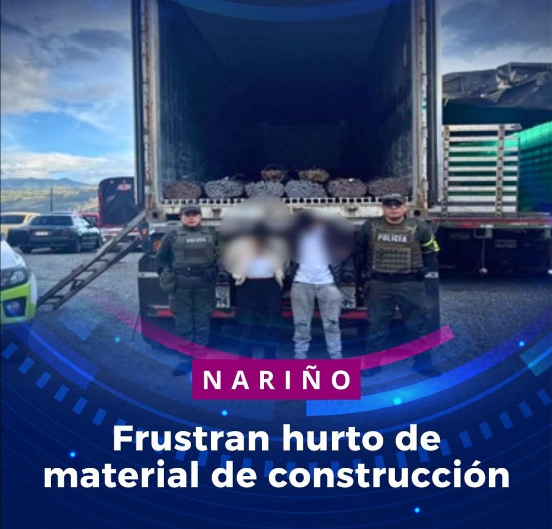 La Policía Nacional logró frustrar un intento de hurto de más de 100 millones de pesos en mercancía en la vía Pasto-Rumichaca, en Ipiales. Dos hombres fueron capturados en flagrancia transportando 2.286 varillas y más de 6.400 kilos de alambre, sustraídos de un establecimiento comercial.