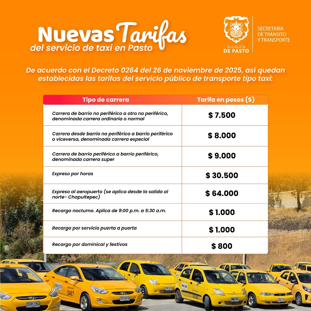 A partir de hoy entró en vigencia el nuevo cuadro tarifario para el servicio de taxi en Pasto, una medida oficializada por el municipio con el objetivo de poner orden definitivo a los cobros dentro del área urbana y evitar abusos hacia los usuarios.