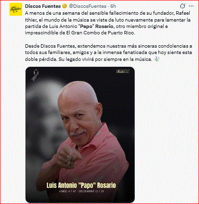 Desde Discos Fuentes, una de las casas discográficas más importantes de la música tropical, destacaron que la obra de ‘Papo’ Rosario “vivirá por siempre en la música”