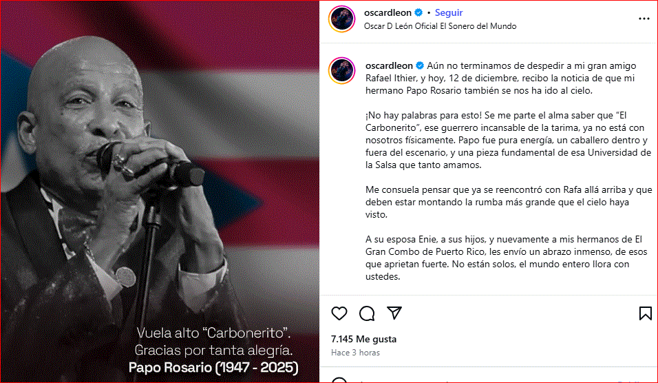 Óscar D’León fue uno de los primeros en pronunciarse públicamente. En un emotivo mensaje, expresó, «Aún no terminamos de despedir a mi gran amigo Rafael Ithier, y hoy recibo la noticia de que mi hermano Papo Rosario también se nos ha ido al cielo»