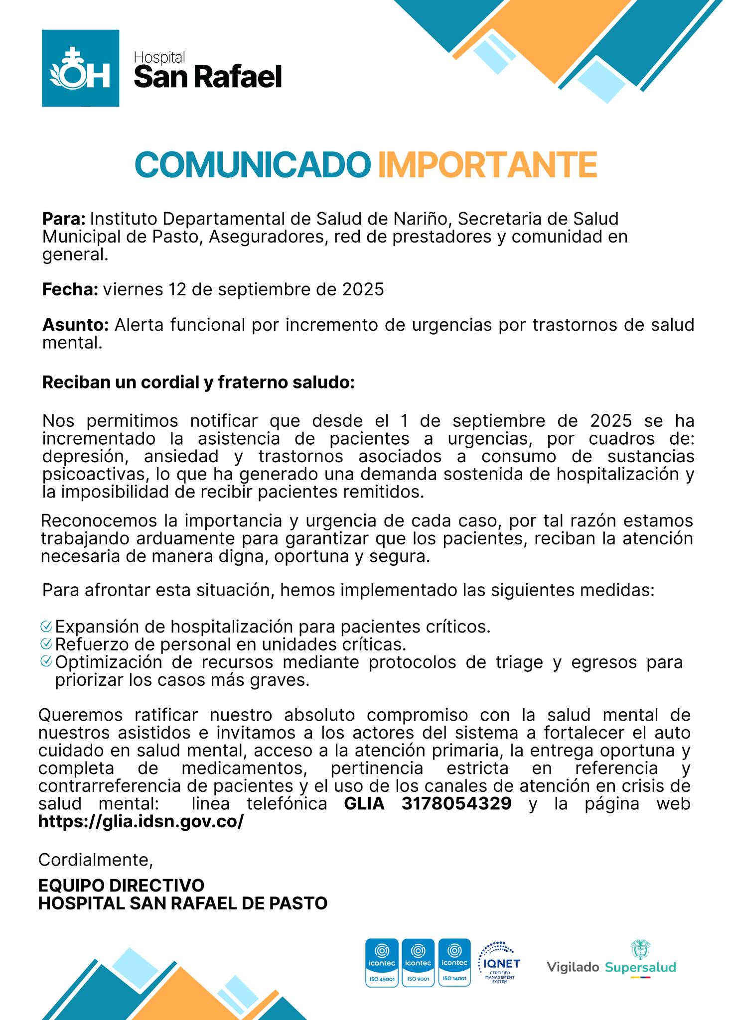 El Hospital San Rafael de Pasto ha emitido una alerta debido al aumento significativo de casos de salud mental que requieren atención urgente. Desde el 1 de septiembre, se ha registrado un incremento en la asistencia de pacientes a urgencias por depresión, ansiedad y trastornos asociados al consumo de sustancias psicoactivas.
