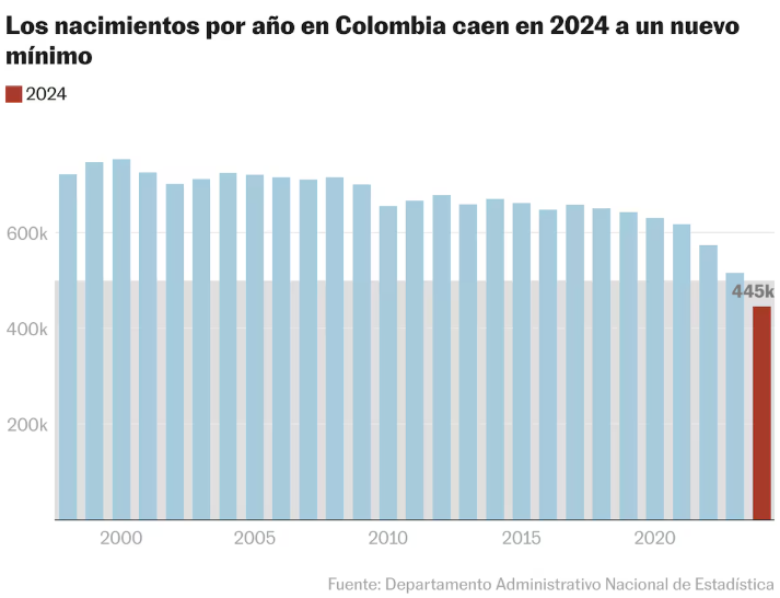 Durante 2024, Colombia registró la cifra más baja de nacimientos en la década reciente: 453.901 bebés, según los datos publicados por el Departamento Administrativo Nacional de Estadística (DANE). Esta cifra representa una caída del 12 % con respecto al año anterior, y una disminución acumulada de 31,3 % frente a 2015.