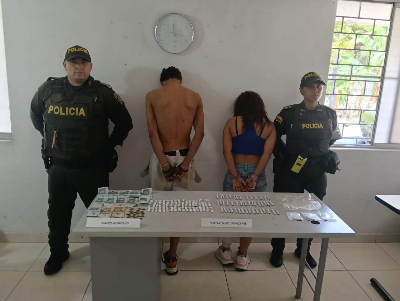 El comandante (e) del Distrito Especial de Policía Palmira, teniente coronel Edinson Aux Mora, informó que durante el allanamiento se incautaron 350 dosis de marihuana y 250 dosis de base de coca, junto con dinero en efectivo, producto de la venta ilegal de estas sustancias. Los capturados, ‘Alias Z’ y ‘Alias Lady’, acumulaban un total de 15 anotaciones judiciales por delitos como tráfico de estupefacientes, homicidio, hurto y fuga de presos, lo que demuestra su historial delictivo.