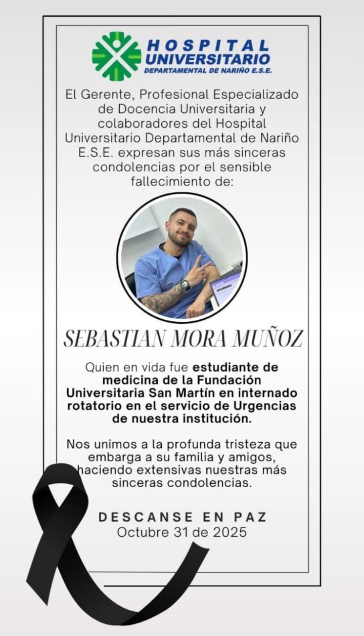 La víctima mortal fue identificada como Sebastián Mora Muñoz, un joven de 26 años y estudiante de últimos semestres de Medicina de la Fundación Universitaria San Martín, quien actualmente realizaba su internado en el Hospital Universitario Departamental de Nariño, truncando así una prometedora carrera profesional.