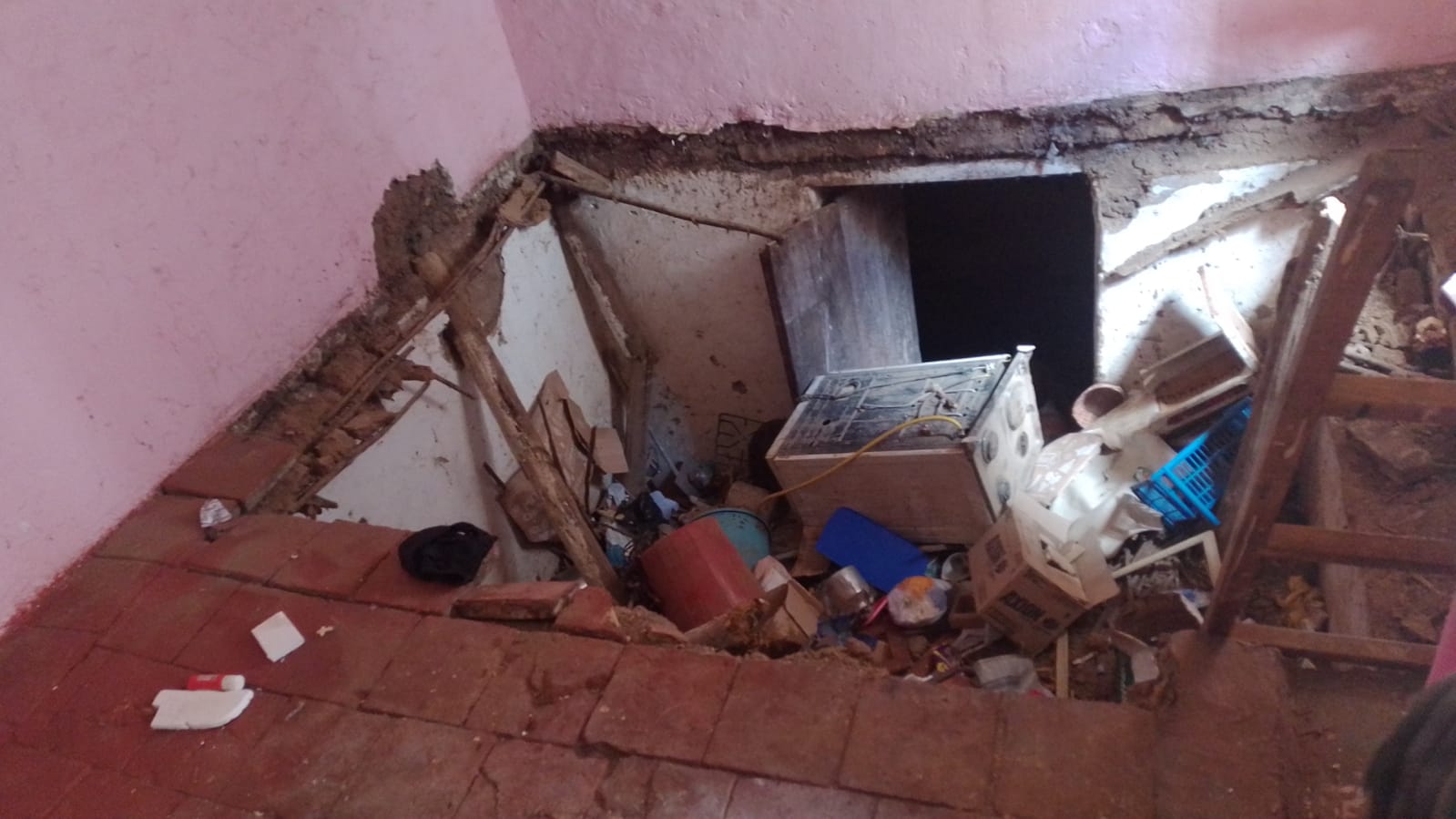 En la carrera 22A con calle 13, en el sector aledaño a San Andresito en pleno centro de la ciudad de Pasto, se desplomó parte del segundo nivel de una vivienda construida en tapia o bahareque.