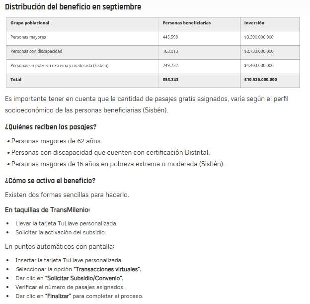 La cantidad de pasajes gratuitos que cada persona recibe depende de su grupo poblacional y su clasificación en el Sisbén. Por ejemplo, personas con discapacidad en el grupo A del Sisbén reciben hasta 12 pasajes mensuales, mientras que los adultos mayores en el mismo grupo obtienen 8 pasajes. Por lo tanto, el Distrito se asegura de que el apoyo sea proporcional a la necesidad de cada persona. Incluso aquellos con una clasificación más alta en el Sisbén o que no la tienen, reciben al menos un pasaje, garantizando que nadie quede excluido de este esquema de apoyo.