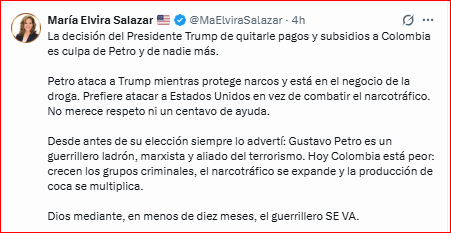 Al final del mensaje escribió «Le recomiendo a Trump leer bien a Colombia y determinar en qué parte están los narcos y en qué parte están los demócratas»