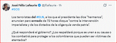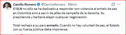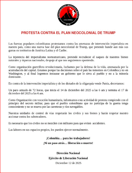 ELN anuncia paro armado de 72 horas en todo el país desde el 14 de diciembre. La guerrilla señaló que la medida es una “protesta” contra lo que califican como una nueva fase del “plan neocolonial” de Donald Trump.