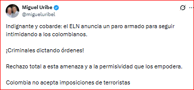 Esta paro armado según el comunicado del grupo guerrillero iniciará el 14 de diciembre del 2025 a las 6 am y termina el 17 de diciembre a las 6 am.