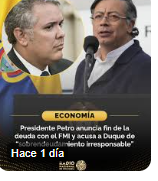 • El presidente Gustavo Petro afirmó que Colombia saldó por completo la deuda contraída con el Fondo Monetario Internacional (FMI) durante el gobierno de Iván Duque, la cual se había manejado vía crédito bilateral con ese organismo. Radio Nacional