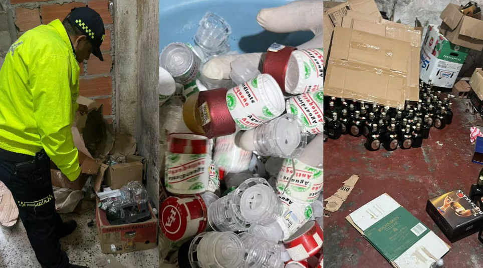 Durante operativos recientes, la policía ha decomisado centenares de botellas vacías, recipientes que contenían licor presuntamente adulterado, tapas, estampillas y otros elementos empleados en la falsificación del producto.