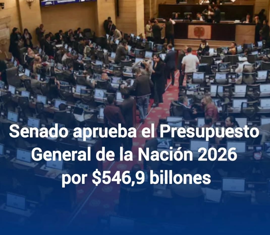 El Senado de la República aprobó el Presupuesto General de la Nación para 2026, por un monto total de $546,9 billones de pesos. La decisión fue tomada con 50 votos a favor y 27 en contra, y el proyecto ahora pasa a sanción presidencial.