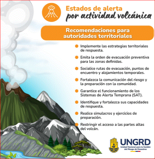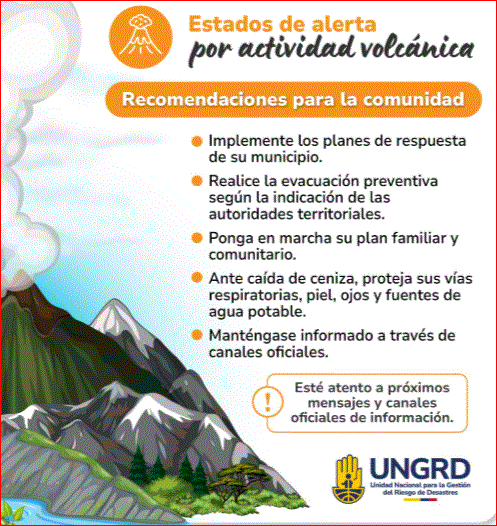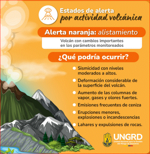La Unidad de Gestión del Riesgo, UNGRD, informó que se mantiene la alerta Naranja al igual que continúa la emisión sostenida de gases y el tremor continuo, indicando actividad interna persistente.